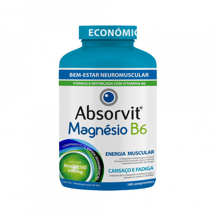ABSORVIT® MAGNÉSIO B6 é um suplemento alimentar em comprimidos de rápida absorção que contém magnésio e vitamina B6.