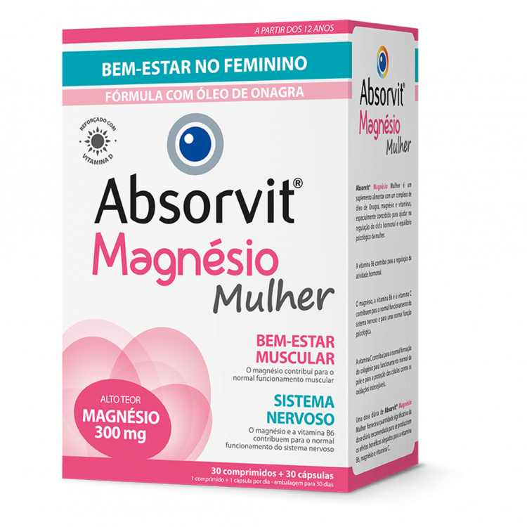 Absorvit® Magnésio Especial Mulher é um suplemento alimentar com um complexo de óleo de Onagra, magnésio e vitaminas, especialmente concebido para ajudar na regulação do ciclo hormonal e equilíbrio psicológico da mulher.