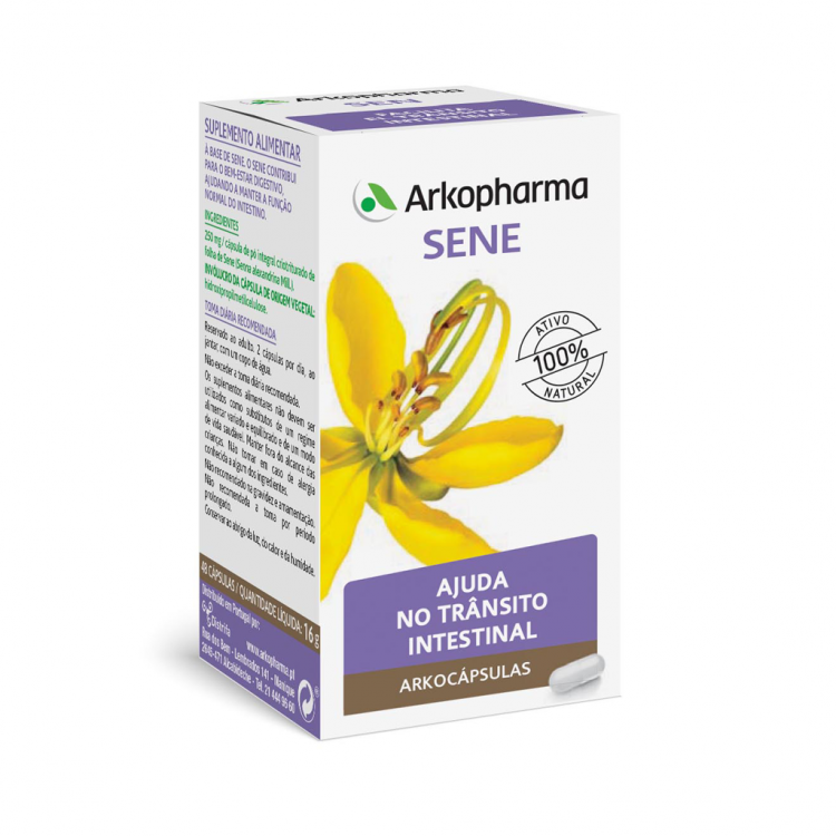 ARKOCÁPSULAS Sene é um suplemento alimentar à base de Sene. O Sene contribui para o bem-estar digestivo, ajudando a manter a função normal do intestino.