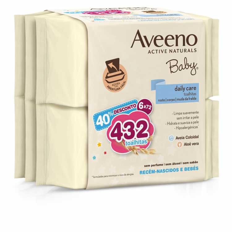 Pack composto por 6 embalagens de Aveeno Baby Toalhitas de 72 unidades. Aveeno Baby Toalhitas é um cuidado de limpeza, adequado à limpeza do corpo, rosto e zona da fralda do bebé. Limpa delicadamente a pele, sem a irritar, graças aos tensioativos suaves. Hidrata, suaviza e acalma a irritação da pele, graças à sua composição à base de aveia e aloé vera. Sem sabão, álcool, parabenos e perfume.