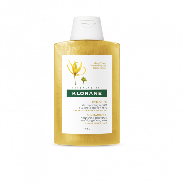 Klorane Capilar Champô Ylang Ylang para cabelos expostos ao sol nutre e protege a fibra capilar e a cor do cabelo. Antissal, antiareia e anticloro