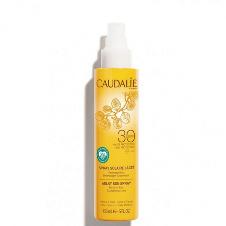 Caudalie Solaire Spray Lácteo SPF30 confere hidratação e um bronzeado luminoso. Filtro solar hidratante para o corpo, de proteção elevada contra os raios UVA e UVB do sol. Resistente à água. Textura não colante. Sem álcool. Fórmula vegan, altamente biodegradável, que respeita o ecossistema marinho - não contém nanopartículas, octinoxato, octocrileno, nem oxibenzona. Não comedogénico. Testado dermatologicamente.