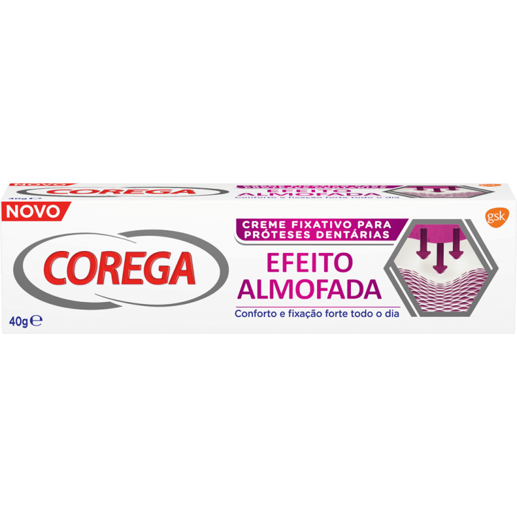 Corega Efeito Almofada é um creme fixativo que ajuda a dar conforto e a proteger as gengivas da pressão, fricção e irritação causada pela prótese dentária. Atua formando uma camada de gel hidro-activo e contém carbómero e carboximetilcelulose. Desenvolvido para começar a atuar imediatamente, ajuda a amortecer com uma camada efeito almofada durante todo o dia.