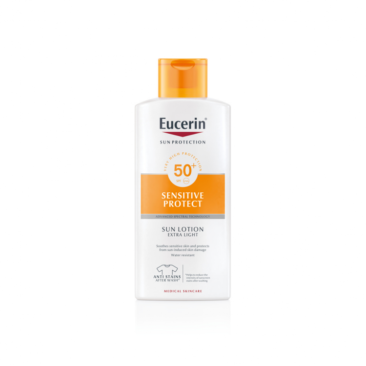 Eucerin Loção Solar Extra Light FPS 50+ tem uma textura extra leve que é absorvida imediatamente na pele. Proporciona uma protecção UV elevada e é resistente à água.
