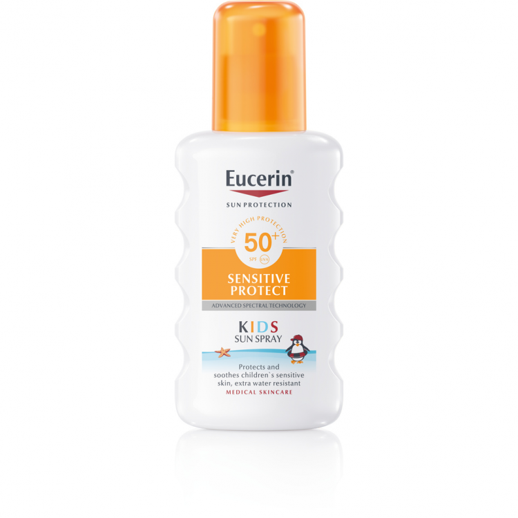 Eucerin Spray Solar Crianças FPS50+ é um spray fácil de aplicar, extra resistente à água, não gorduroso, que protege a pele das crianças contra queimaduras solares e reduz o risco de danos da pele a longo prazo induzidos pelos UV.