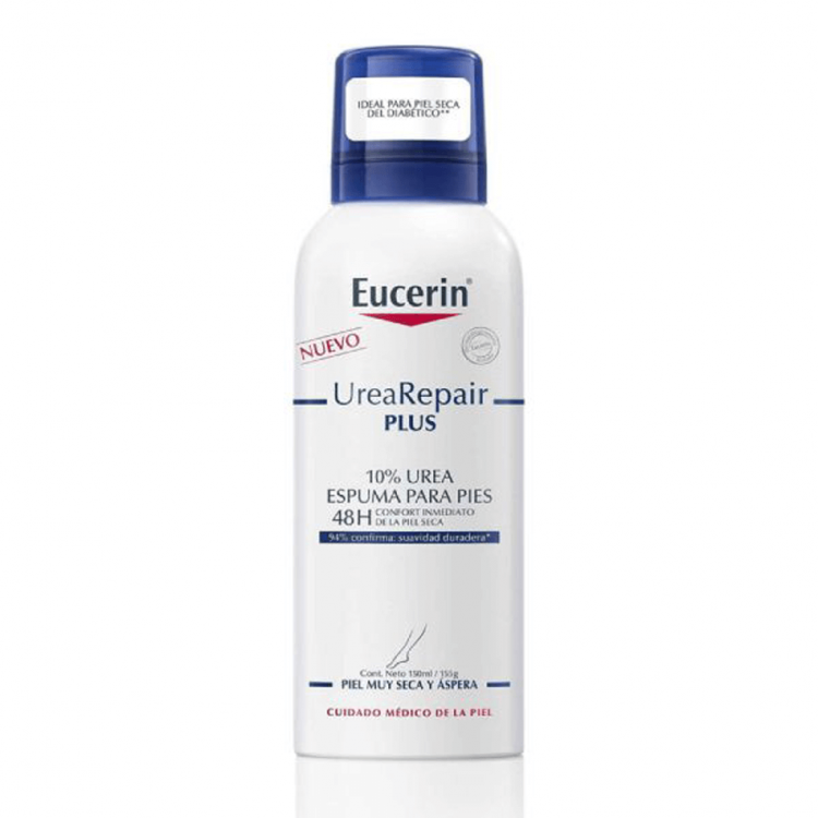 Eucerin UreaRepair PLUS Espuma de Pés 10% Ureia atua na pele áspera e seca dos pés através de uma hidratação intensa, que proporciona um alívio imediato. Este cuidado específico para os pés combina ingredientes-chave para atuar na pele seca de forma eficaz. A Ureia continua a ser o ingrediente estrela no cuidado da pele seca. Os ingredientes clássicos como os Fatores Naturais de Hidratação oferecem uma hidratação intensa enquanto que as Ceramidas fortalecem a barreira cutânea e previnem a perda de humidade. Estes atuam em conjunto com o Dexpantenol e o Decanediol, dois ingredientes ativos que se destacam no cuidado dos pés: O Dexpantenol pela sua capacidade de promover a regeneração natural da pele e o Decanediol conhecido por reduzir os micro-organismos responsáveis pelas infeções fúngicas. Os resultados clinicamente comprovados demonstram que a nova espuma de pés aumenta a resistência dos pés sensíveis a fungos.