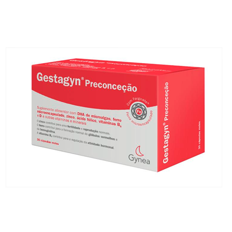 Gestagyn Pré-Conceção da Gynea é um complemento alimentar à base de DHA procedentes de microalgas, ácido fólico, ferro micro-encapsulado, vitamina D e outras vitaminas e minerais especificamente selecionados para cobrir as necessidades nutricionais da mulher na conceção.