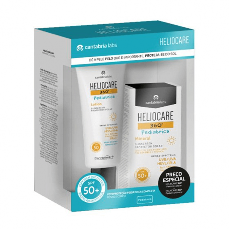 O Coffret Heliocare 360 Pediatrics é um pack que inclui Loção FPS50 200ml e Mineral FPS50+ 50ml, indicados para crianças, com ampla cobertura contra UVA, UVB, IV-A e visível.