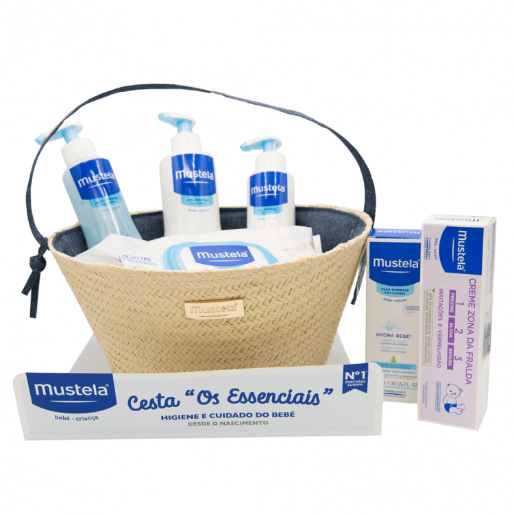 As Cestas "Os Essenciais" com a assinatura Mustela, a versatilidade aos cuidados mais especializados. Disponível em 3 cores e com um moderno design exclusivo. Contém os produtos: Água de Limpeza (300ml), Creme Zona da Fralda 123 (50ml), Gel Lavante (500ml), Hydra Bebé Creme Rosto (40ml), Hydra Bebé Leite Corporal (300ml).