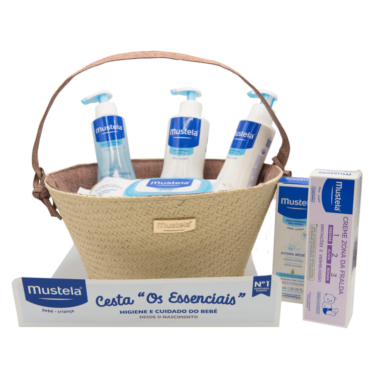 As Cestas "Os Essenciais" com a assinatura Mustela, a versatilidade aos cuidados mais especializados. Disponível em 3 cores e com um moderno design exclusivo. Contém os produtos: Água de Limpeza (300ml), Creme Zona da Fralda 123 (50ml), Gel Lavante (500ml), Hydra Bebé Creme Rosto (40ml), Hydra Bebé Leite Corporal (300ml).