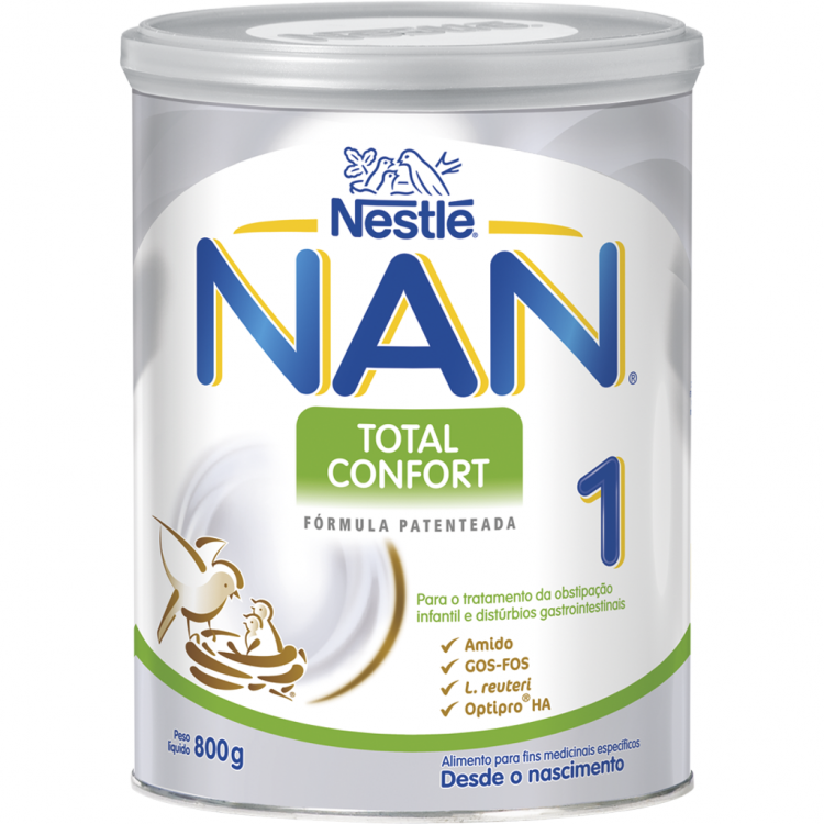 NAN TOTAL CONFORT 1 é um alimento para fins medicinais específicos, para a gestão nutricional de lactentes com distúrbios gastroinstestinais (como a obstipação, cólicas e regurgistação). É adequado para a alimentação de lactentes, como fonte alimentar única, desde o nascimento até aos 6 meses de idade..NAN TOTAL CONFORT 1 com fibras GOS/FOS para melhorar as características das fezes. Com L.reuteri, culturas probióticas ativas, para melhorar a frequência das fezes e flora intestinal, reduzindo o choro excessivo associado às cólicas. Espessado com amido para melhorar a regurgitação.NAN CONFORT 1 contém OPTIPRO HA, uma mistura única de proteínas moderadamente hidrolisadas, obtidas através de um tratamento especial, que promove um esvaziamento gástrico facilitados e suavização das fezes e está clinicamente comprovado reduzir o risco alérgico nos lactentes em risco de desenvolver alergias (lactentes com familiares alérgicos), em especial na alergia comum da pele, nos cruciais primeiros anos de idade.