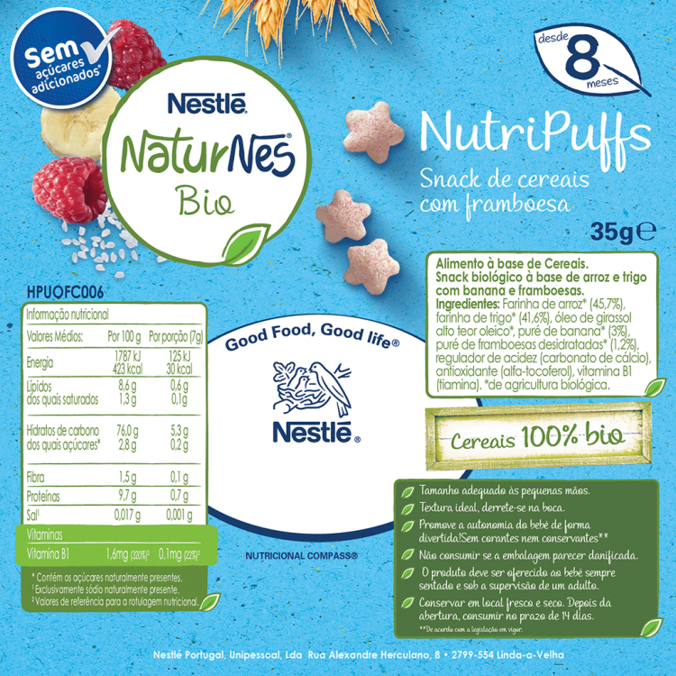 NOVO NATURNES Bio NutriPuffs Framboesa é um snack biológico nutritivo à base de arroz e trigo com banana e framboesas. Sem açúcares nem sal adicionados, contendo apenas os açúcares naturalmente presentes.