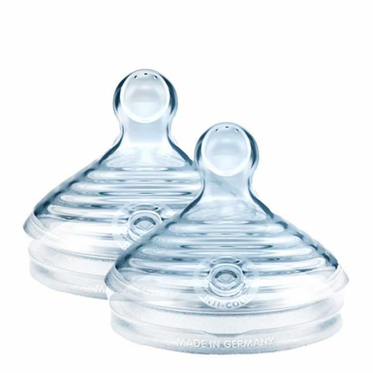 Tetinas em silicone NUK Nature Sense: área de apoio para os lábios do bebé mais larga e flexível, topo da tetina muito suave com vários orifícios, similar ao mamilo da mãe.