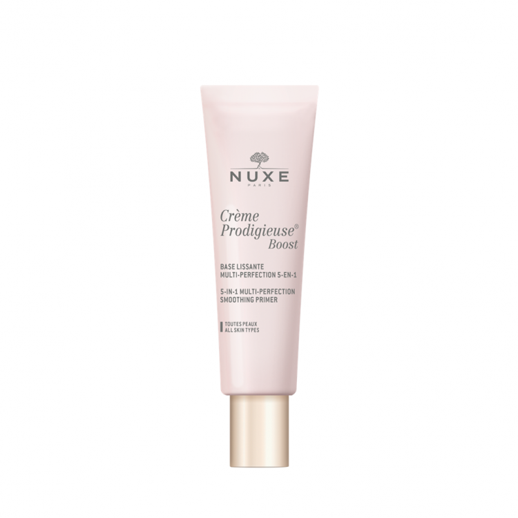 Nuxe Prodigieuse Boost Base Alisante é um cuidado Multi-Perfeição com correção de 5 sinais em simultâneo: rídulas e rugas superficiais, marcas de fadiga, tez sem brilho, imperfeições e excesso de sebo. Sem cor, a sua textura difusa revela uma pele perfeita, mesmo sem maquilhagem, com um efeito natural de “pele nua”.