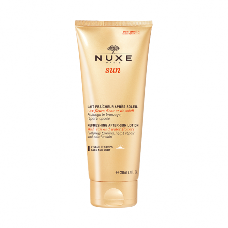 SUN Refreshing After Sun Lotion Face & Body da Nuxe repara a pele e fornece a hidratação necessária. A loção proporciona uma pele sedosa e prolonga o bronzeado por 2 semanas inteiras.
