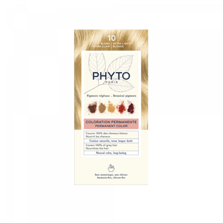Phyto Phytocolor - 10 Louro Extra Claro é uma coloração permanente, indicada para todos os tipos de cabelo. A sua fórmula contém uma elevada concentração de pigmentos vegetais que conferem uma coloração intensa e matizada; óleo de monoi e jojoba que sublimam a cor e nutrem a fibra capilar; extrato de casca de juazeiro com ação suavizante e antiprurido; e Epaline™ que protege o couro cabeludo contra irritações. Cobre 100% dos cabelos brancos e proporciona uma cor intensa e natural, com reflexos luminosos. Fácil de aplicar, permite uma repartição precisa e uniforme desde a raiz até às pontas. Sem amoníaco.