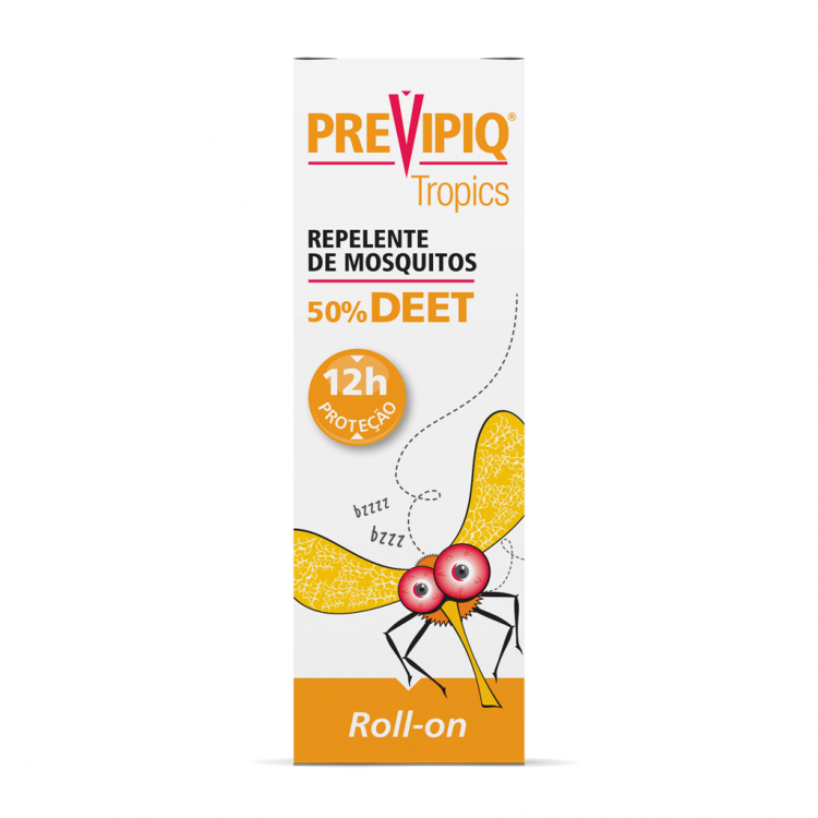 PREVIPIQ® Tropics Roll-on (50% DEET) proporciona em média 12 horas de proteção contra as espécies de mosquitos mais comuns. Para algumas espécies de mosquitos tropicais o tempo de proteção pode ser mais curto.