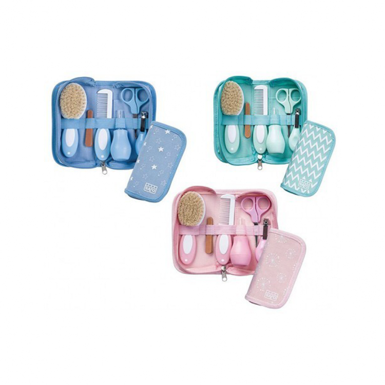 Necessaire de higiene para bebé contendo escova de cerdas suaves e naturais, pente, aspirador nasal, tesoura, limas de unhas e corta-unhas. É um prático estojo com fecho de correr.
