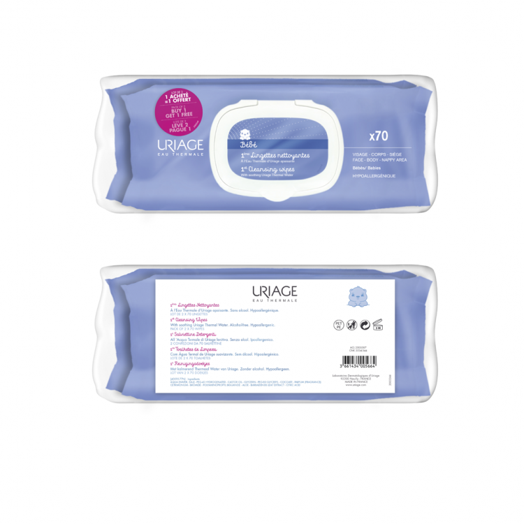Uriage Bebé Pack Toalhitas é um pack que contém 2 embalagens de toalhitas de limpeza extra suave (2x70unid.).