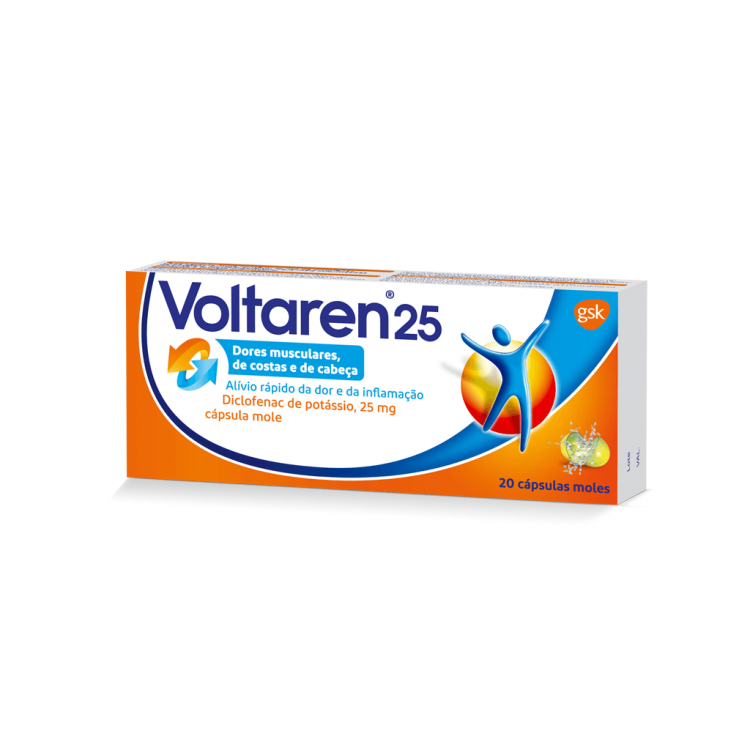 Voltaren 25 em cápsulas moles combate a dor na sua origem e diminui a inflamação. A fórmula concentrada de Voltaren cápsulas moles (25 mg) começa a atuar em 15 minutos, proporcionando um alívio da dor muscular e reumática, dores nas costas, dores menstruais, dor de cabeça e dor de dentes.